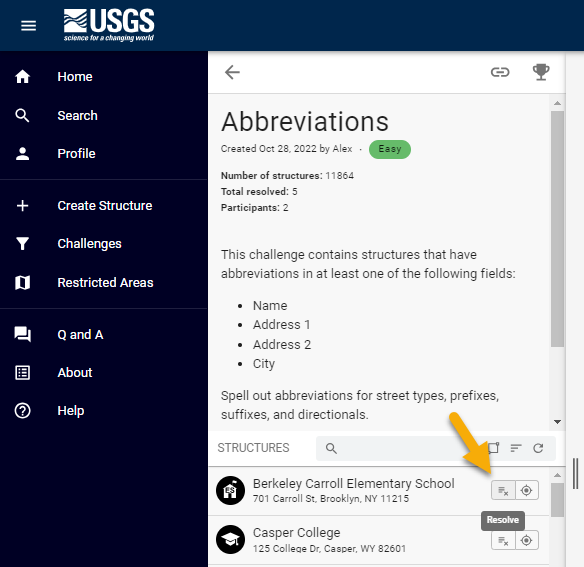 For an edit to count towards a challenge, the editing window must be opened with the “Resolve” button. You can click on a point to open the editing window and make changes, but editing a point that way prevents the system from tracking your participation in a particular challenge (if this is something you’re interested in). If you’d like points you’ve edited to count towards your participation in challenges, then remember to open the editing window using the “Resolve” button.