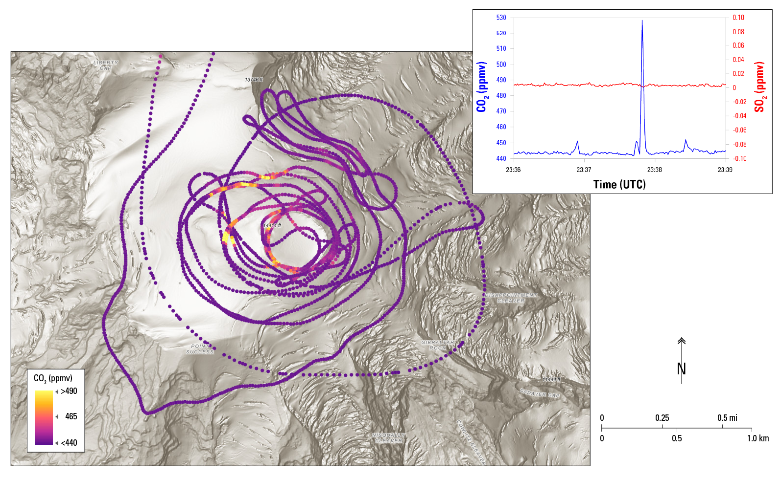 A shaded relief map of Mount Rainier with GPS track from the gas observation flight. The colors correspond to CO2 levels in parts per million by volume (ppmv) that were measured during the flight. Yellow points indicate elevated CO2 levels, which were located near visibly degassing volcanic gas vents. The small inset plot shows example CO2 and SO2 data. Note that clear CO2 peaks (blue line, left axis) were observed as the aircraft passed over visibly degassing vents, but no corresponding SO2 was detected (red line, right axis).