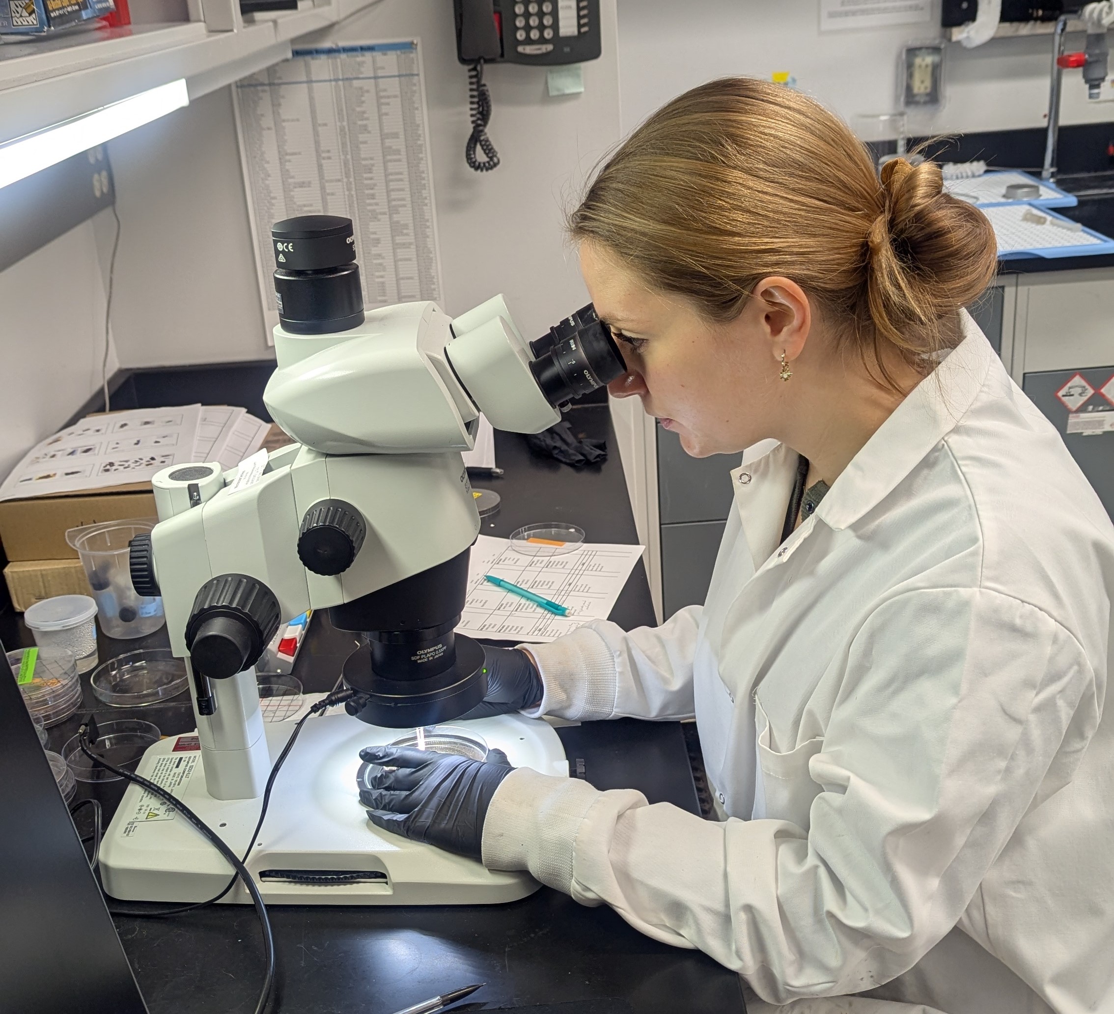 USGS Scientist Molly Huber analyzing macroscopic charcoal under a binocular microscope