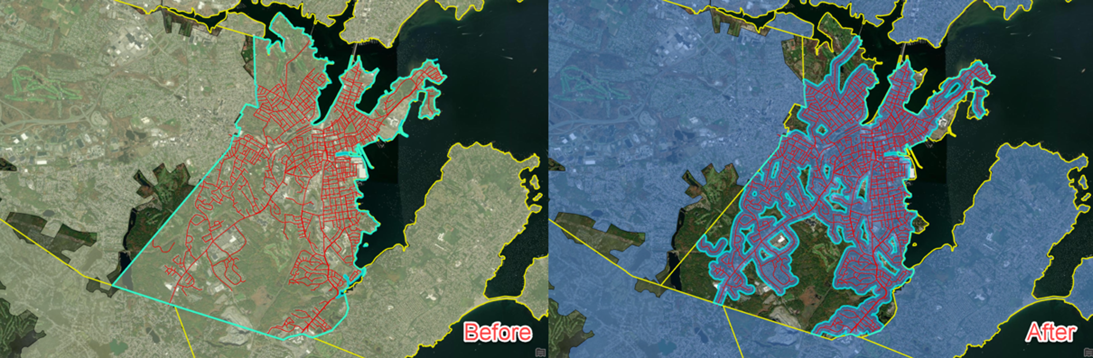 Side-by-side comparison of a public water utility’s draft service area boundary (left) and the refined boundary using utility feedback (right).