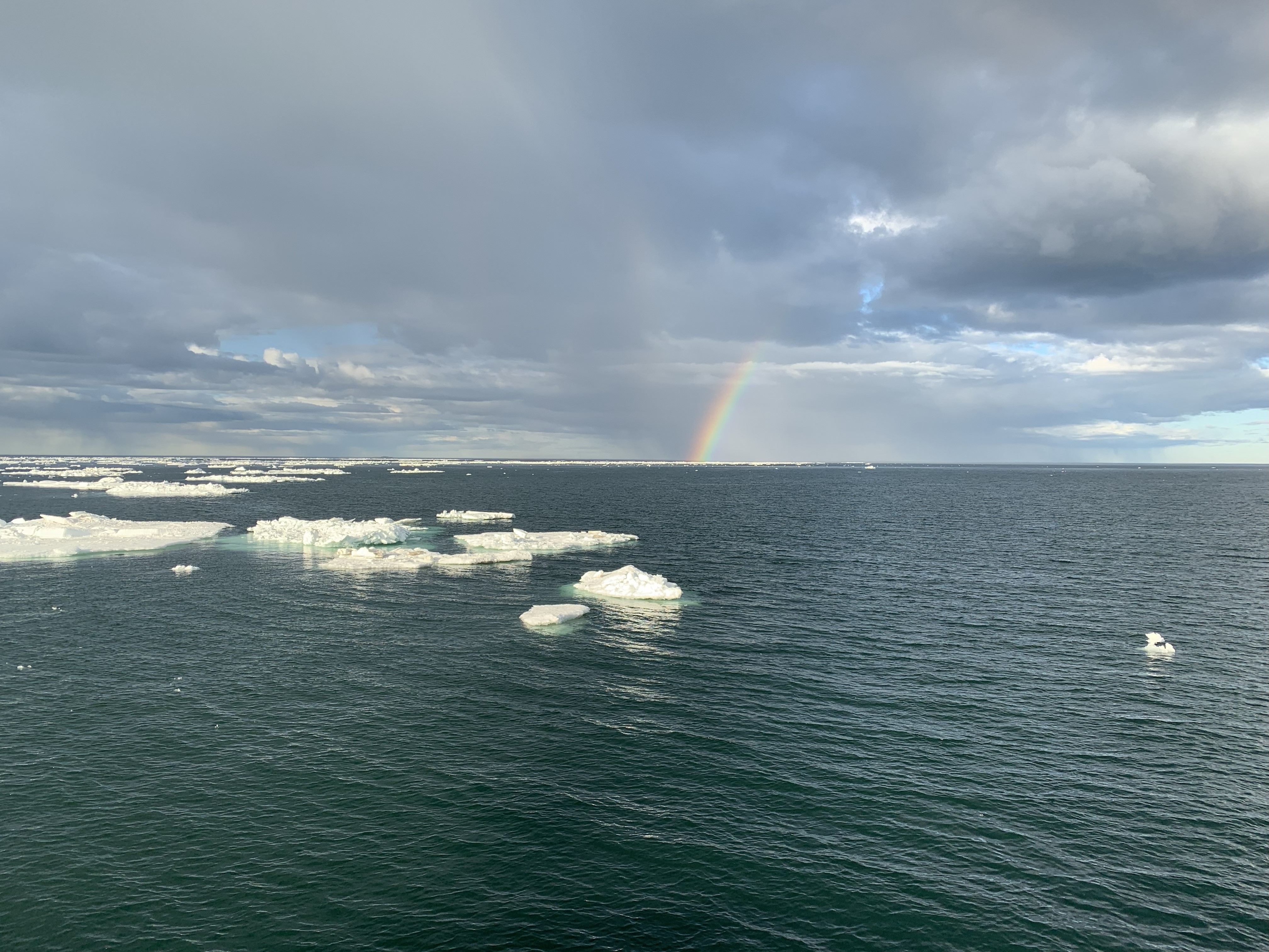 A rainbow emerges from an evening shower in the Chukchi Sea. USGS and the U.S. Fish and Wildlife Service conducted joint research expeditions in 2023, 2024, and 2025 to collect data on the Pacific walrus population. Skin biopsy samples are collected from walruses hauled-out on sea ice to help scientists estimate population abundance and trend. Age structure data is also collected from walruses hauled-out on sea ice, which will help scientists estimate survival.