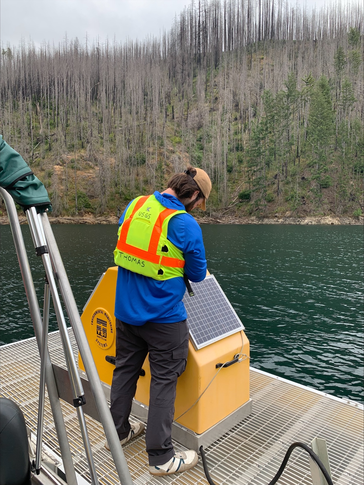 Hydrologic technician during field work maintaining the Blue River Lake water-quality profiler.