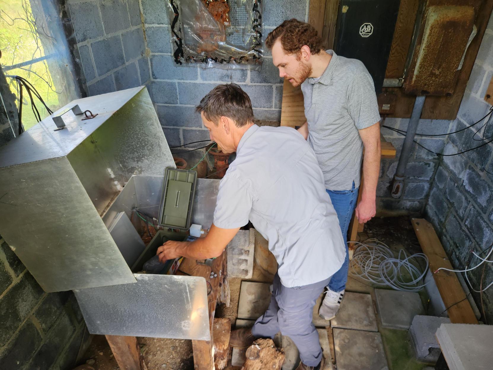 Joel Maynard (VA DEQ) demonstrates to Nick Gilmore (WVTF) how data is collected from State Observation Well 019 in Christiansburg, Virginia. Data for this site can be found at USGS Water Data for the Nation.