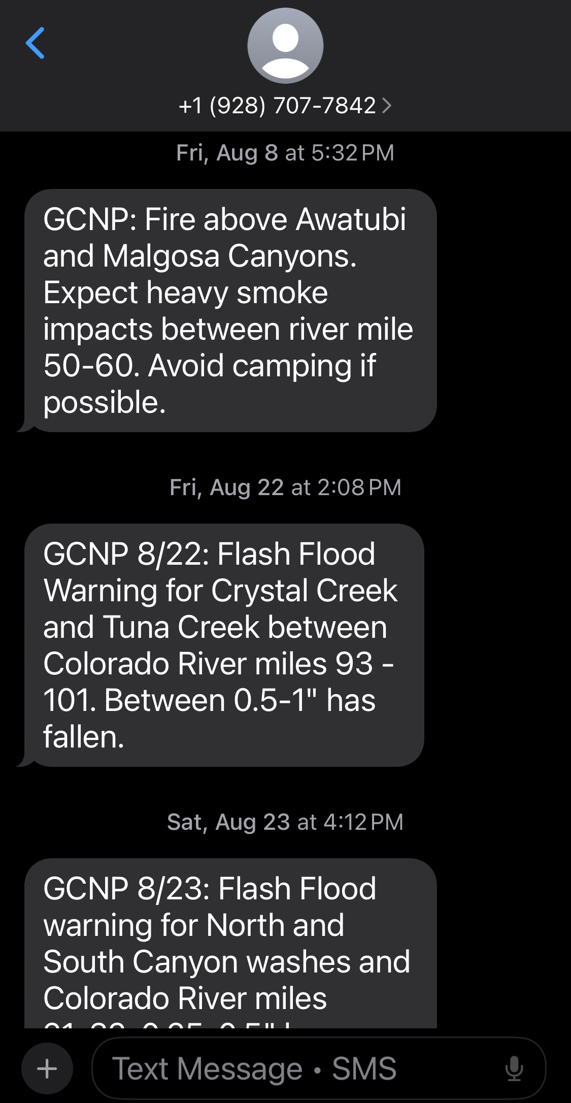 Grand Canyon river alert system alert texts in August 2025. For more information, see New backcountry alert system warns Grand Canyon visitors about flash floods in areas without cellular signal | U.S. Geological Survey
