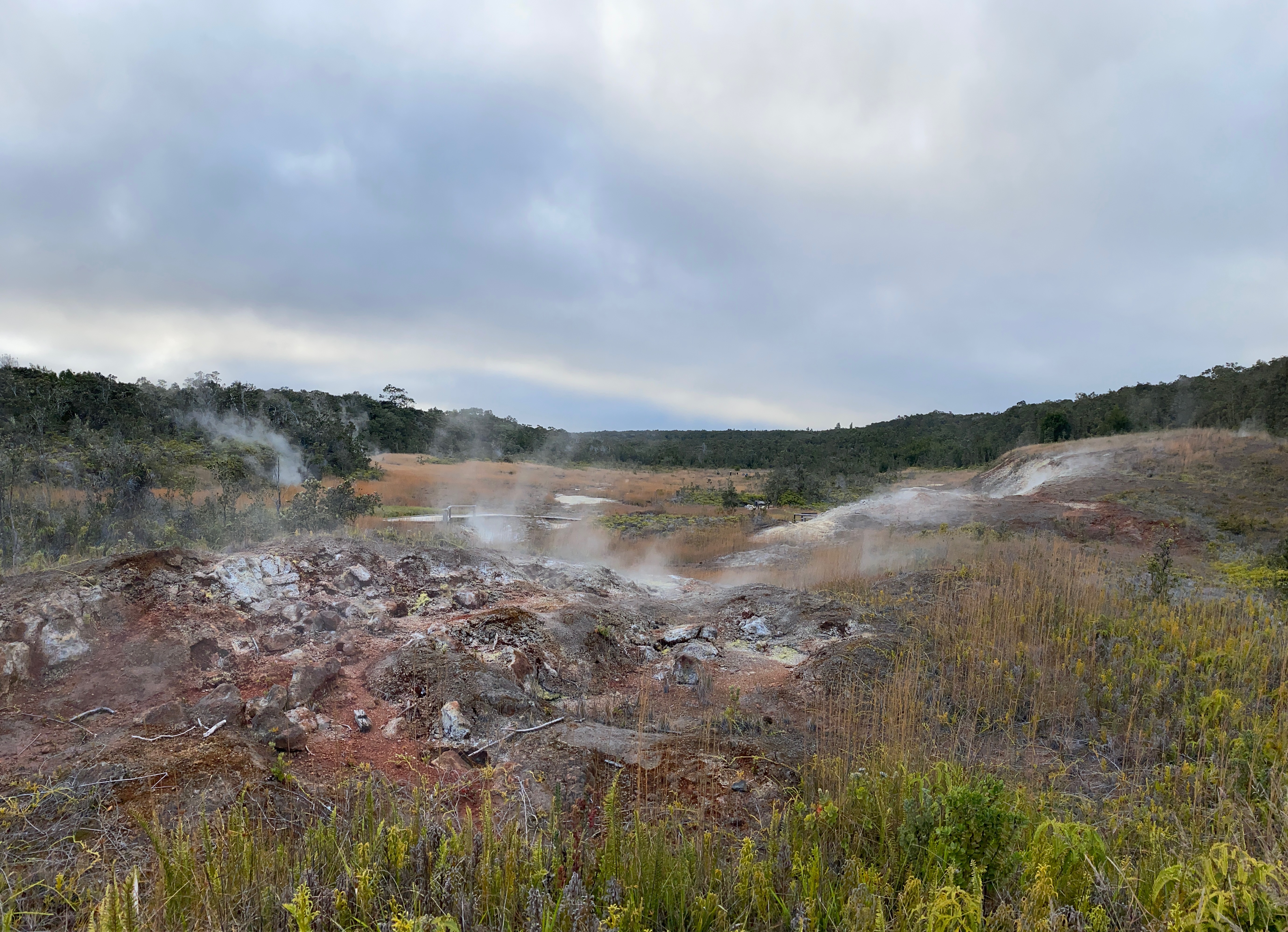 The Ha‘akulamanu trail within Hawai‘i Volcanoes National Park passes through the Sulphur Banks area, where long-term degassing near Kaluapele (Kīlauea summit caldera) has altered the basalt to colorful minerals including yellow sulfur, white gypsum, and reddish-brown hematite. USGS photo by C. Sealing.