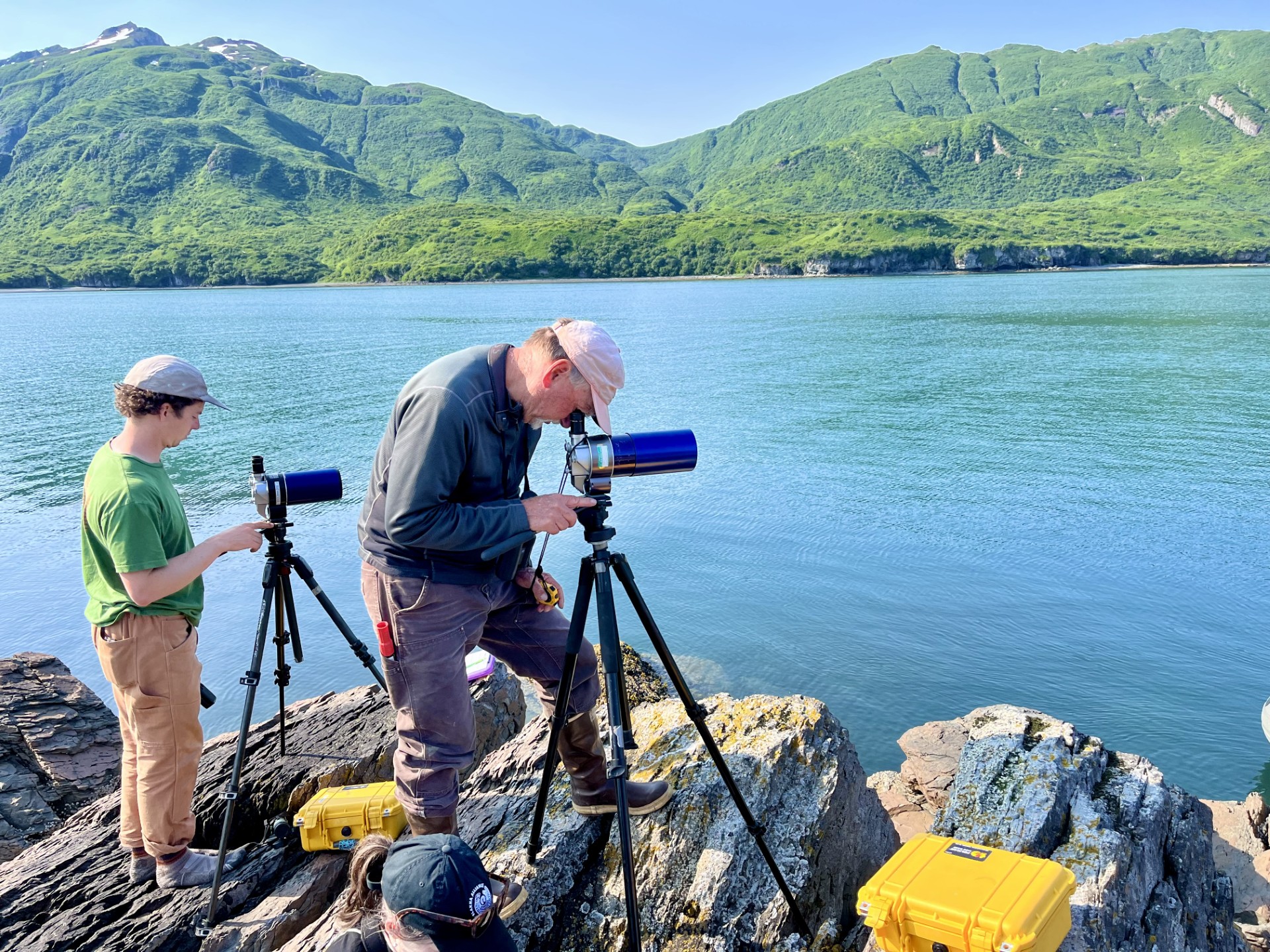 A pair of scientists observe sea otter foraging behavior at Katmai National Park and Preserve. Questar telescopes are used to assist with prey identification.
