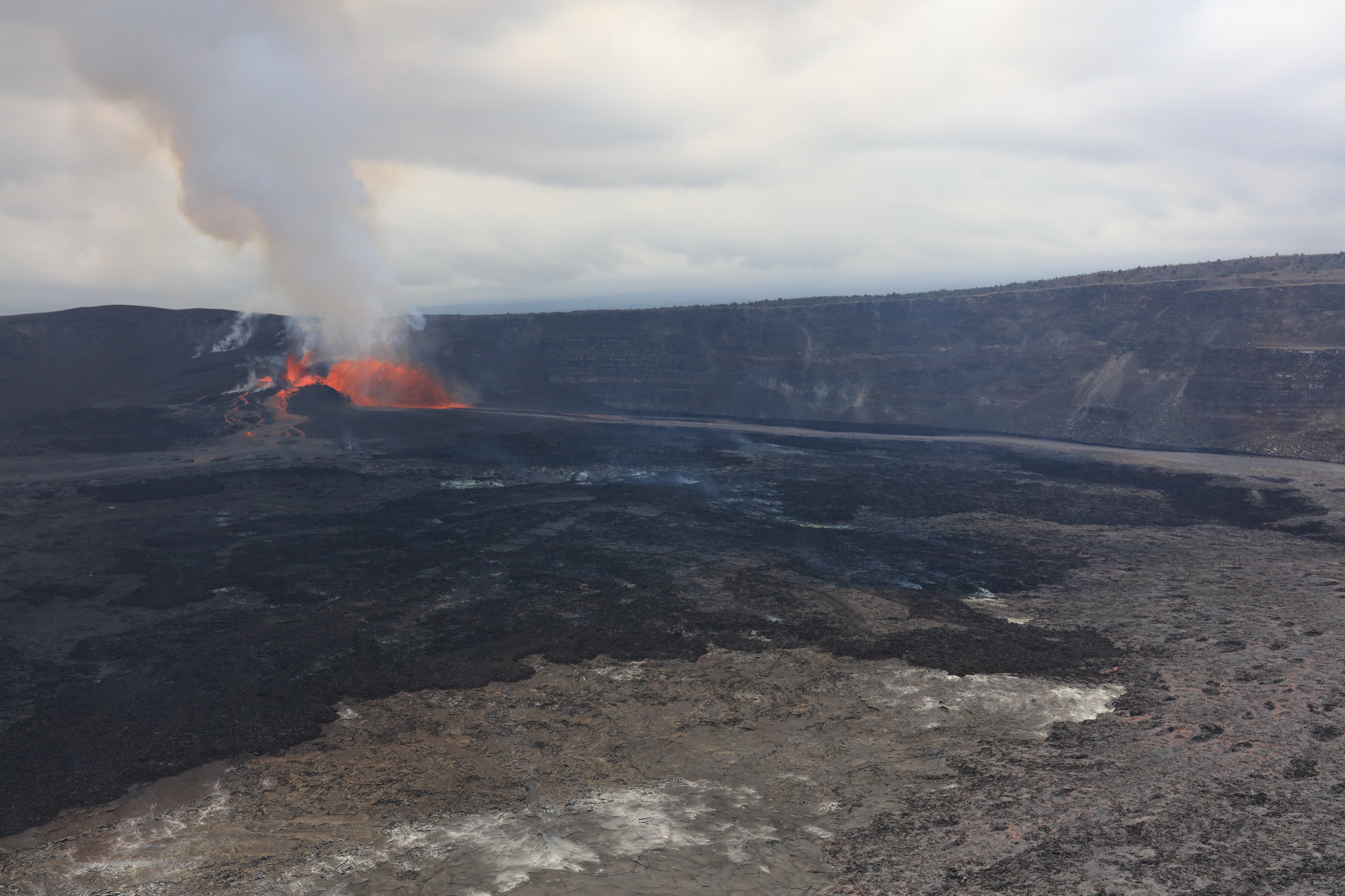Aerial view of the episode 32 lava fountain within Halema‘uma‘u during a USGS Hawaiian Volcano Observatory monitoring helicopter overflight at approximately 1:00 pm on September 2, 2025. Three vents were erupting from the western side of Halemaʻumaʻu, and feeding lava flows into the western side of the crater. The silvery lava on the right side (north) of the photo is a new lava flow being emplaced from the north vent. The darker black lava flows were emplaced during episode 31. USGS photo by D. Downs.