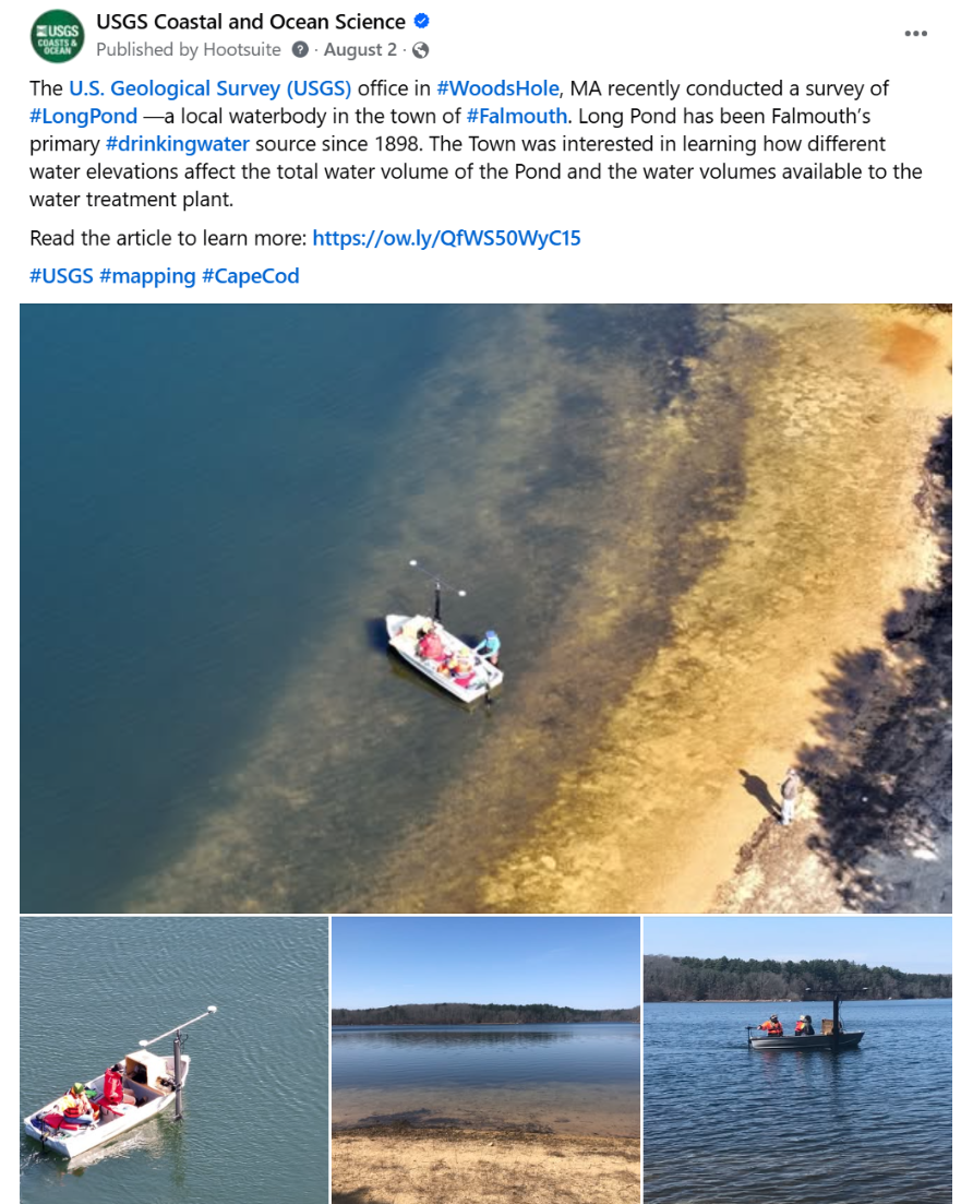 The USGS office in Woods Hole, MA recently conducted a survey of Long Pond—a local waterbody in the town of Falmouth. Long Pond has been Falmouth’s primary drinking water source since 1898. The Town was interested in learning how different water elevations affect the total water volume of the Pond and the water volumes available to the water treatment plant.