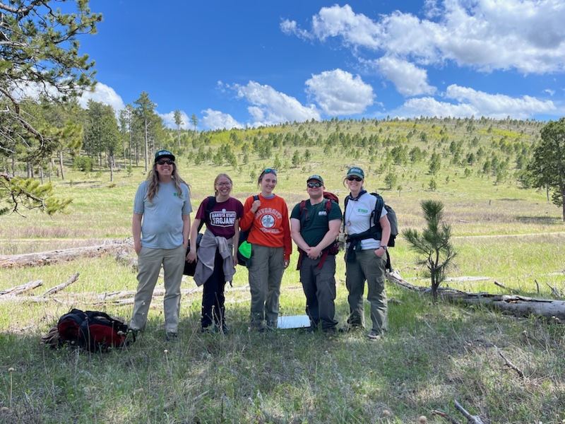 USGS Earth Resources Observation and Science (EROS) interns Hazel Mebius and Katelyn Woolfrey are flanked by USGS employees Josh Picotte, Chris Woody and Birgit Peterson. Mebius and Woolfrey did fieldwork to study fire severity in Black Hills National Forest and Sequoia National Park, comparing traditional field methods with lidar scans.