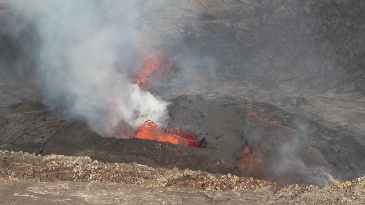 Eruptive activity continues in Halema‘uma‘u, at the summit of Kīlauea. The west vent remains active with low fountaining in a slightly perched pond set within the cone.