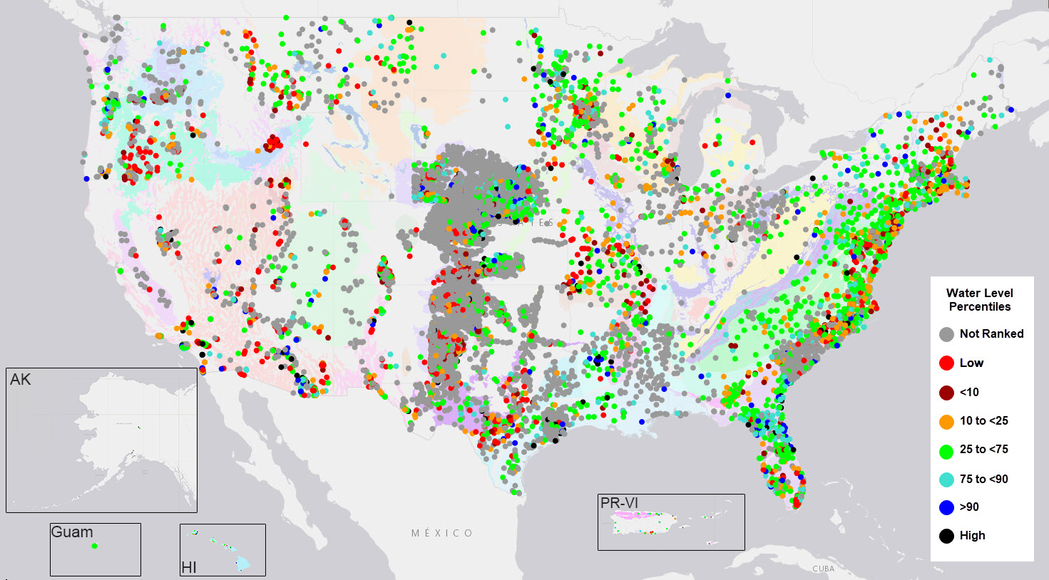 The National Ground-Water Monitoring Network (NGWMN) is a compilation of selected groundwater monitoring wells from Federal, State, and local groundwater monitoring networks across the nation. This map displays groundwater-level conditions in the NGWMN on September 30, 2022, relative to data for each well from the same month for every year data are available. As of October 3, 2022, this online database includes groundwater-level data from 17,853 sites. Users can explore the NGWMN map and data, access web services, or learn more about the network. An explanation of how the statistics are calculated is also available. In this figure, the network is displayed over a map of the Principal Aquifers of the United States. Inset maps are not to scale.