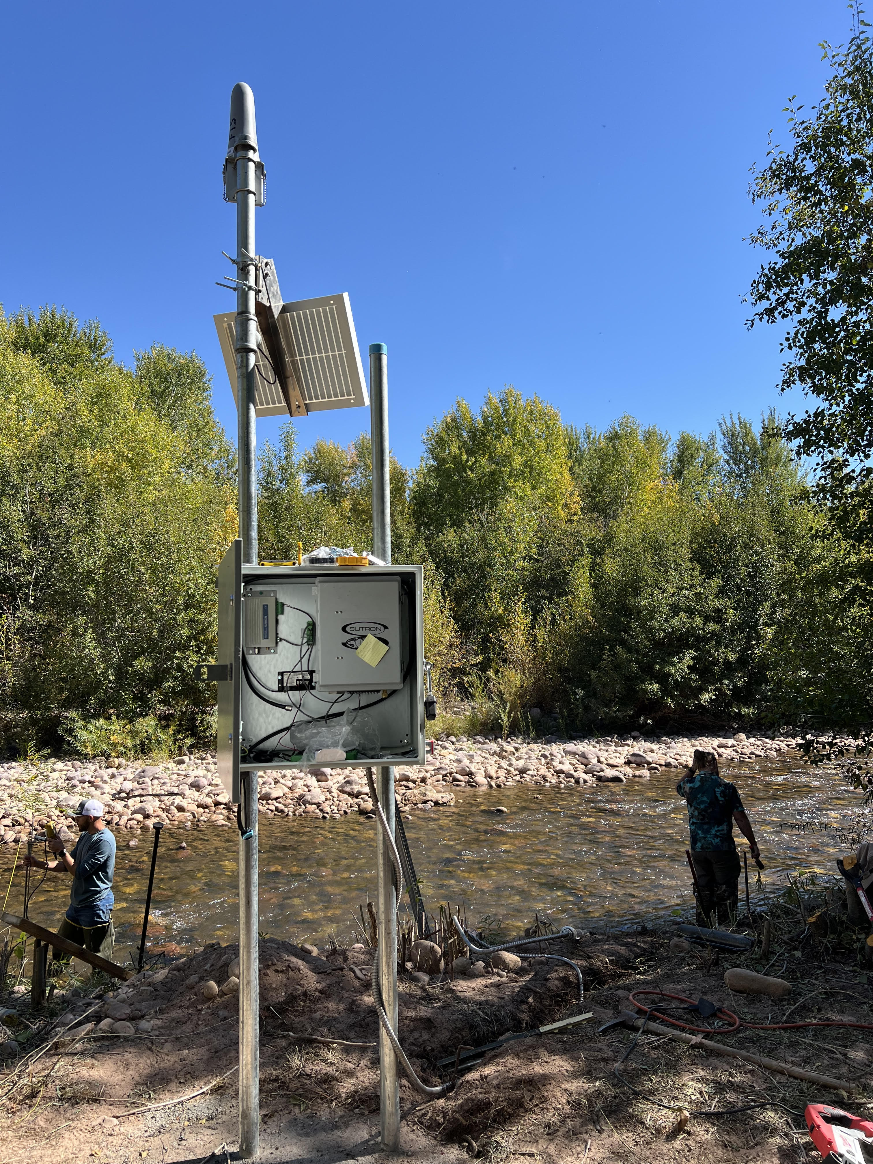 Instrumentation is shown in gage house, which is secured to posts. Hydrotech on left measures discharge in background.