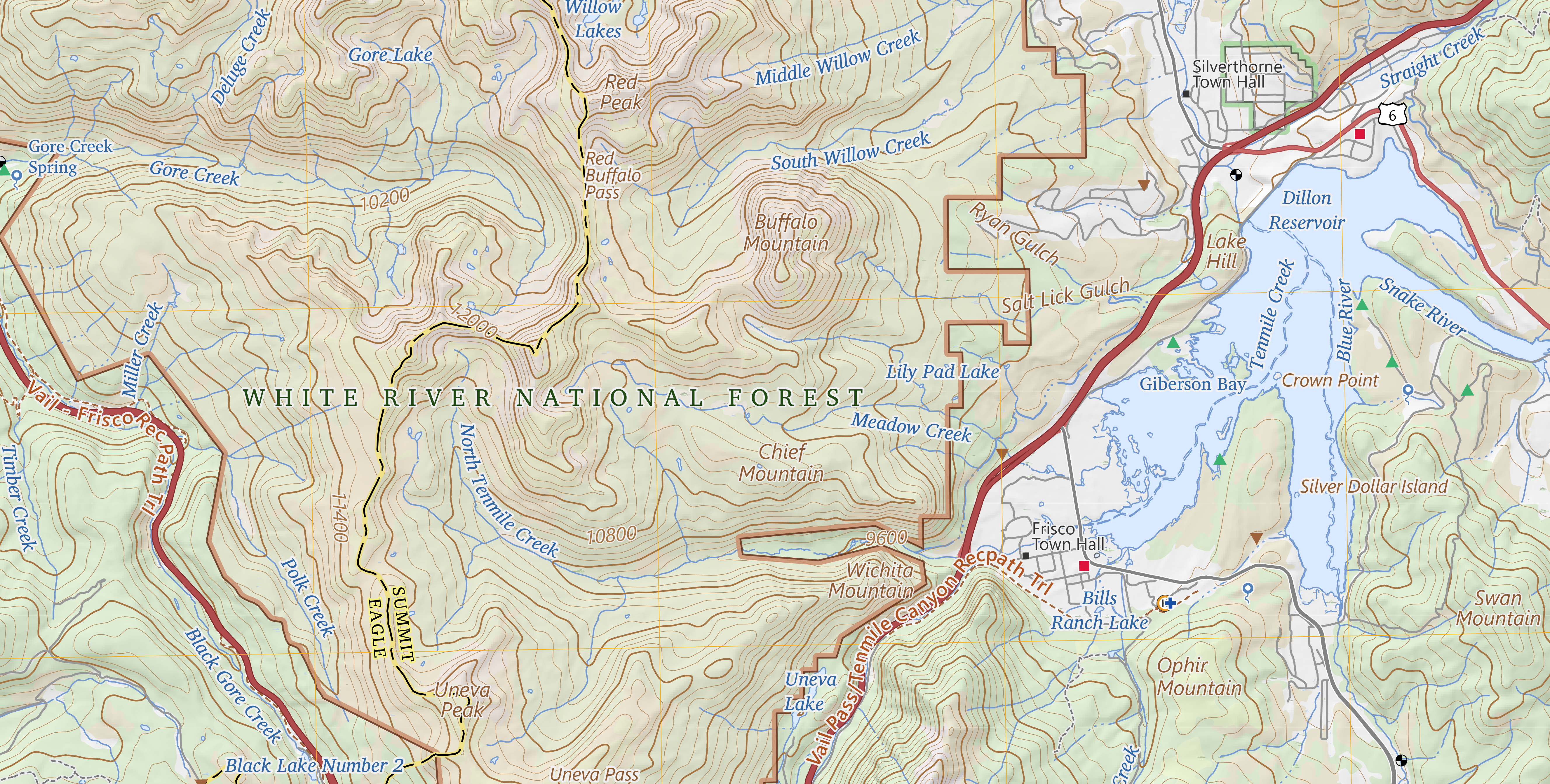 Example map from OnDemand Topo / topoBuilder using the 100K map configuration displaying the Vail quadrangle and Frisco, Colorado.