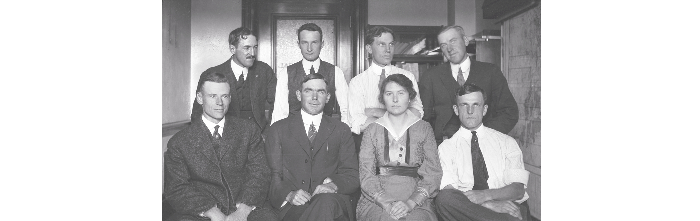 Eight USGS employees in Utah, known as the Salt Lake City Force, pose for photo in Federal Building Office in October 1914.