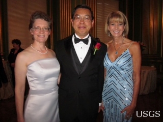 USGS research hydrologist Paul Hsieh (center) with his wife Christine Peterson (left) and USGS Director Marcia McNutt (right) attend the Service to America Medals gala event, where Paul Hsieh's was honored as the 2011 Federal Employee of the Year by the Partnership for Public Service. Hsieh was awarded for providing critical scientific information that proved to be a turning point in ending the worst oil spill in our Nation's history.