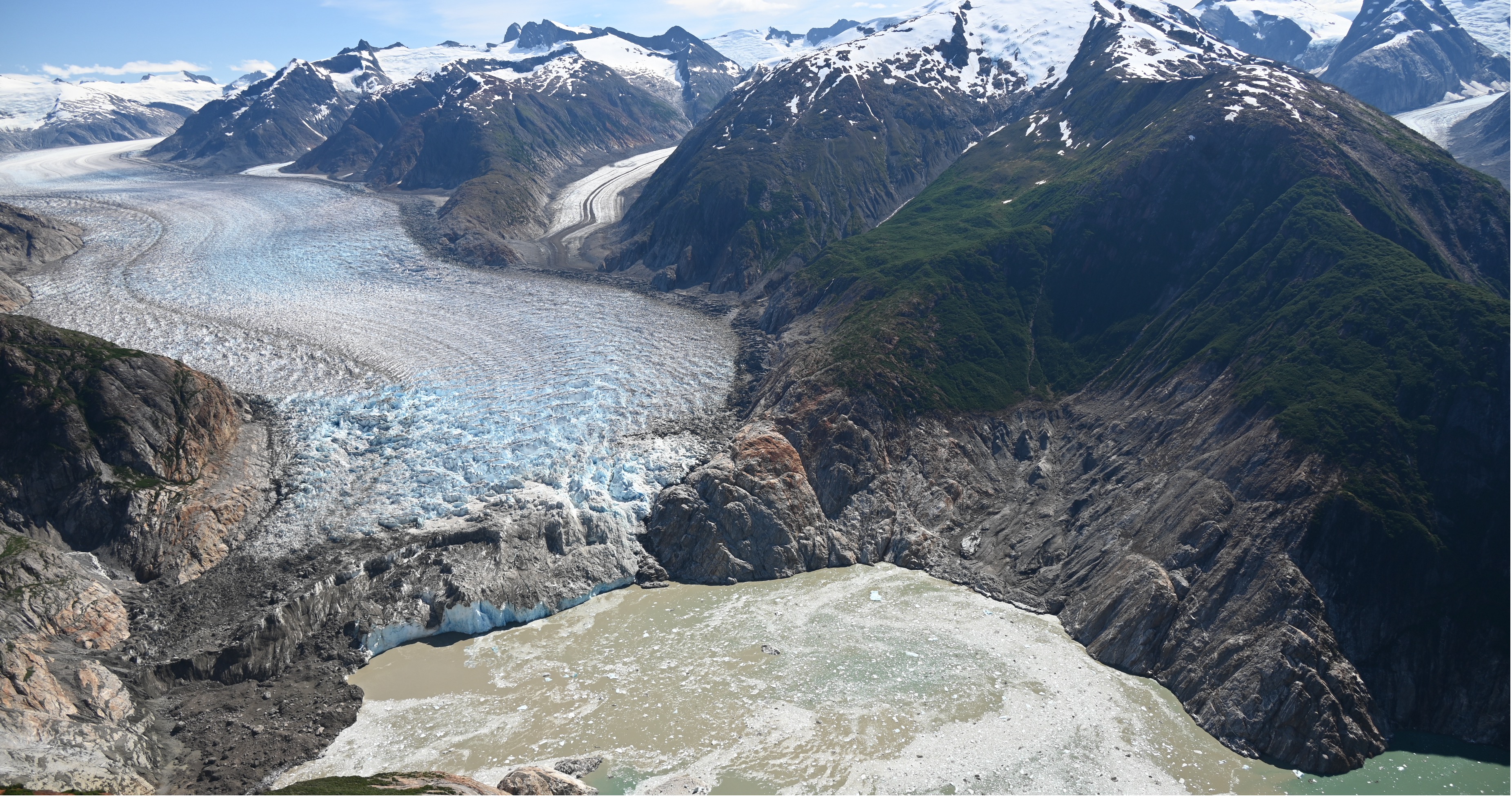 Oblique aerial photo of the August 10, 2025 landslide across-fiord runup zone and South Sawyer Glacier captured during a field reconnaissance overflight on August 13, 2025. Look direction is to the southeast.