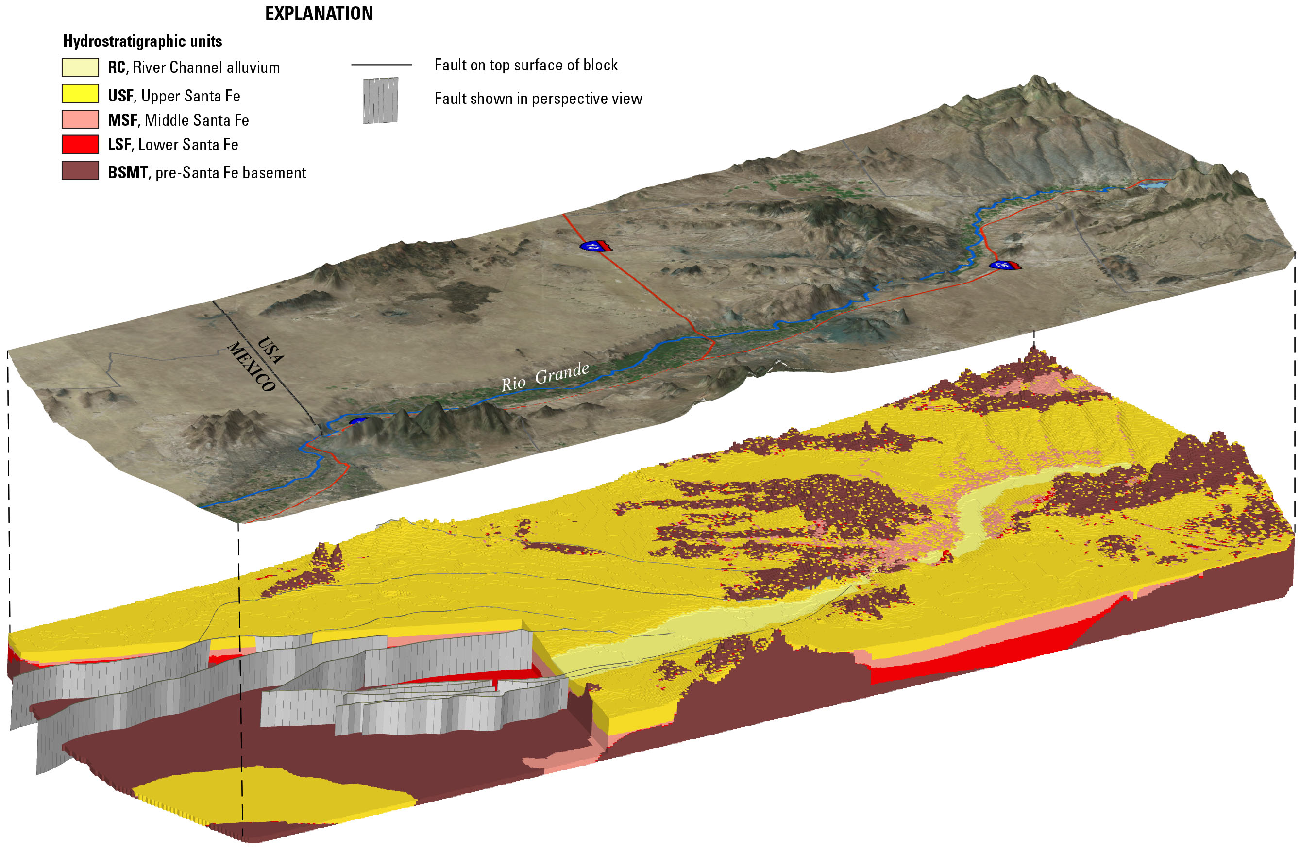 Perspective view, looking from above to the west, of the 3D hydrogeologic framework model of the Rio Grande transboundary region of New Mexico and Texas, USA, and northern Chihuahua, Mexico, including satellite imagery draped on a digital elevation model (upper image) and the three-dimensional hydrogeologic framework solid model (lower image), showing subsurface aquifer units and faults. Model published as U.S. Geological Survey Scientific Investigations Report 2017-5060.