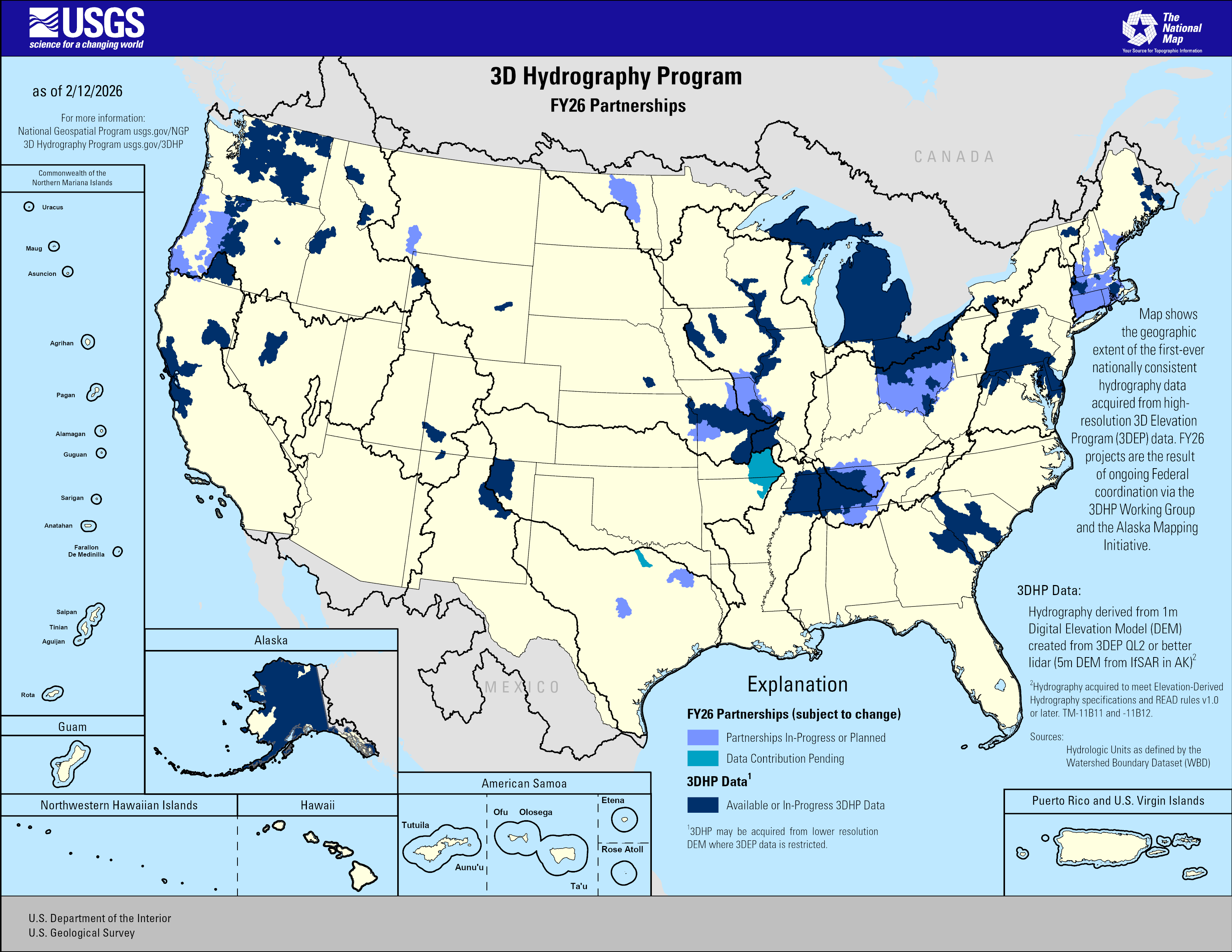 This map of the United States and its territories shows geographic extent of the first-ever nationally consistent hydrography data acquired from high-resolution 3D Elevation Program (3DEP) data. FY26 projects are the result of ongoing Federal coordination via the 3DHP Working Group and the Alaska Mapping Initiative.
