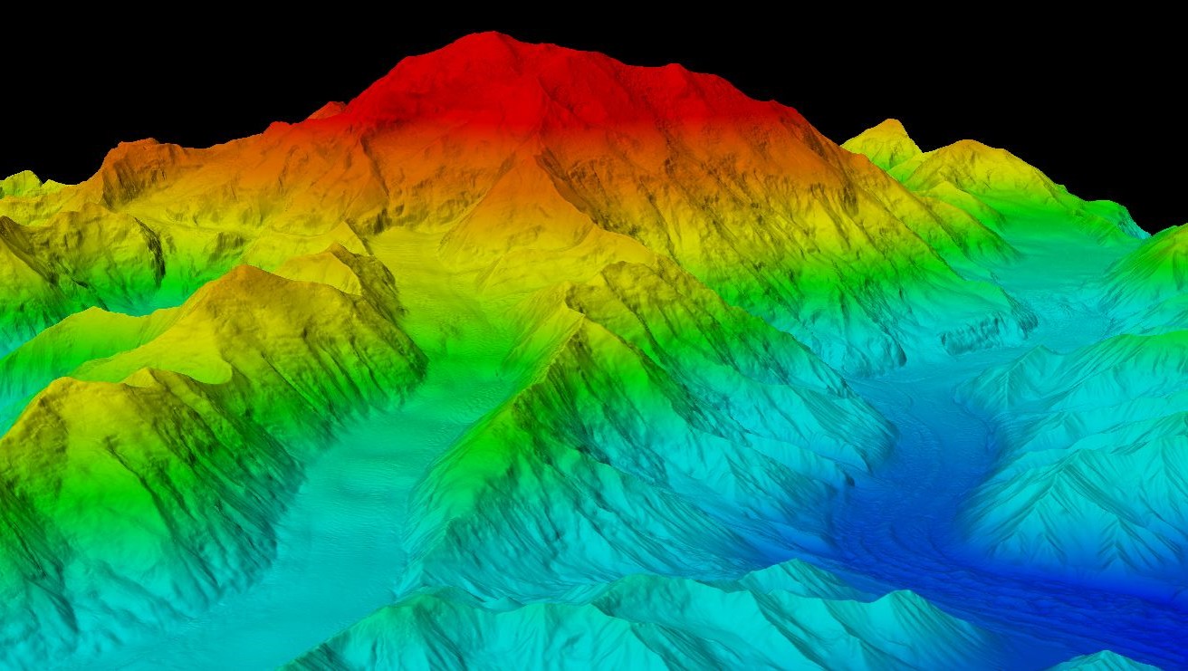 This image is an oblique view of Denali, viewed from the northeast. The image is IFSAR data, colored by elevation, with a hillshade relief applied.