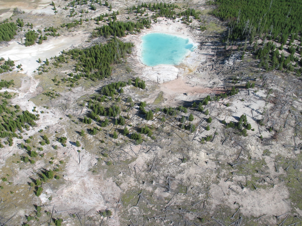 In September 2005, USGS/YVO Postdoctoral Fellow Brita Graham Wall used a radio-controlled camera, attached to a helium-filled balloon to take photos from the sky above the Norris Geyser Basin. Brita used these photos to gain insight into the distribution of cracks and fractures that feed the hot springs at Norris.