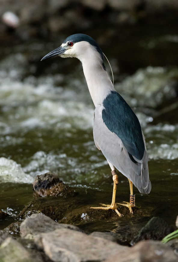 A Black-crowned Night-Heron looks for fish, the bird is banded with a USGS federal metal band and a white colored leg band to help scientists learn more about the bird's biology.