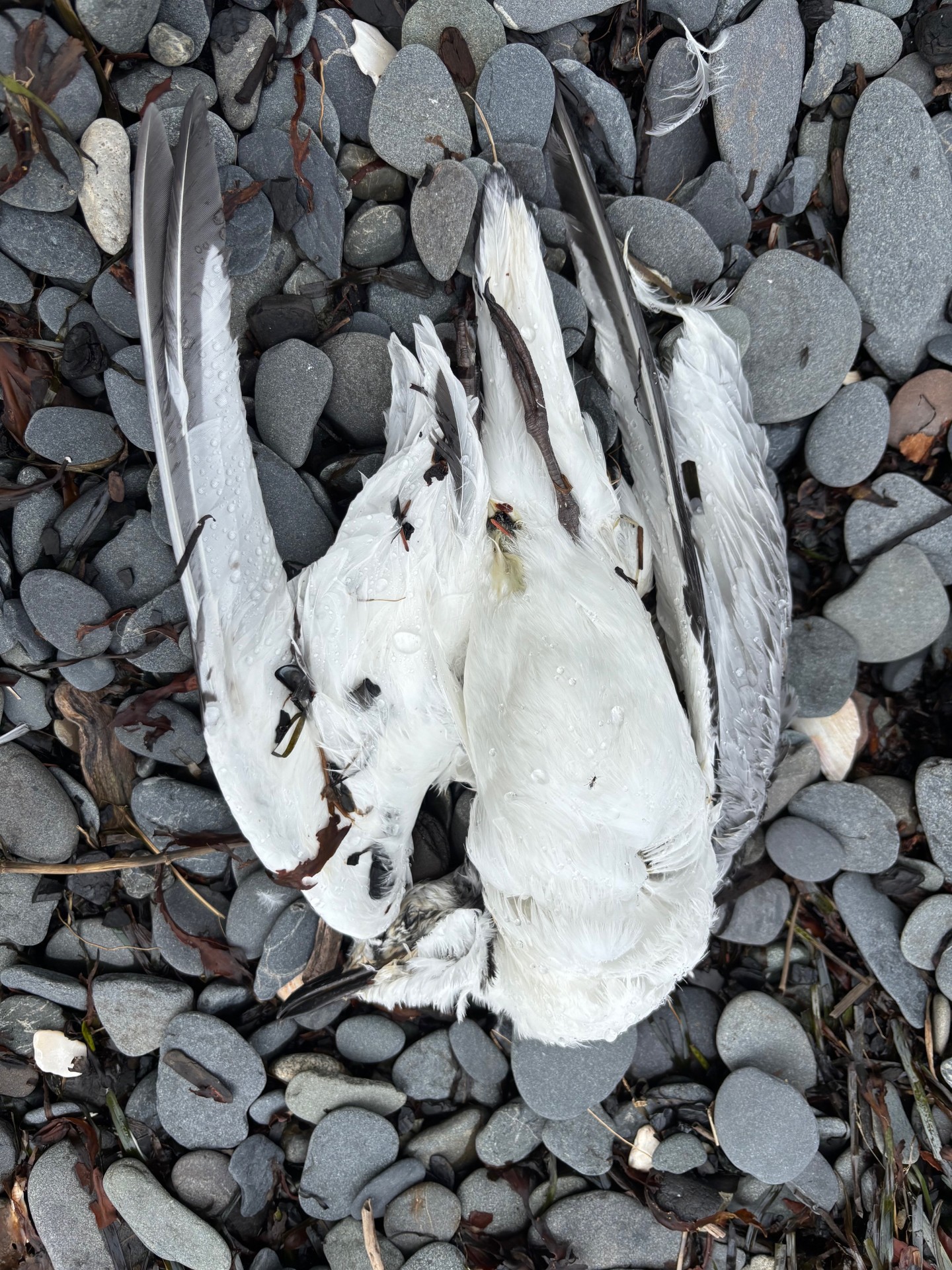 A dead Black-legged Kittiwake lies on the beach on Homer Spit in Kachemak Bay