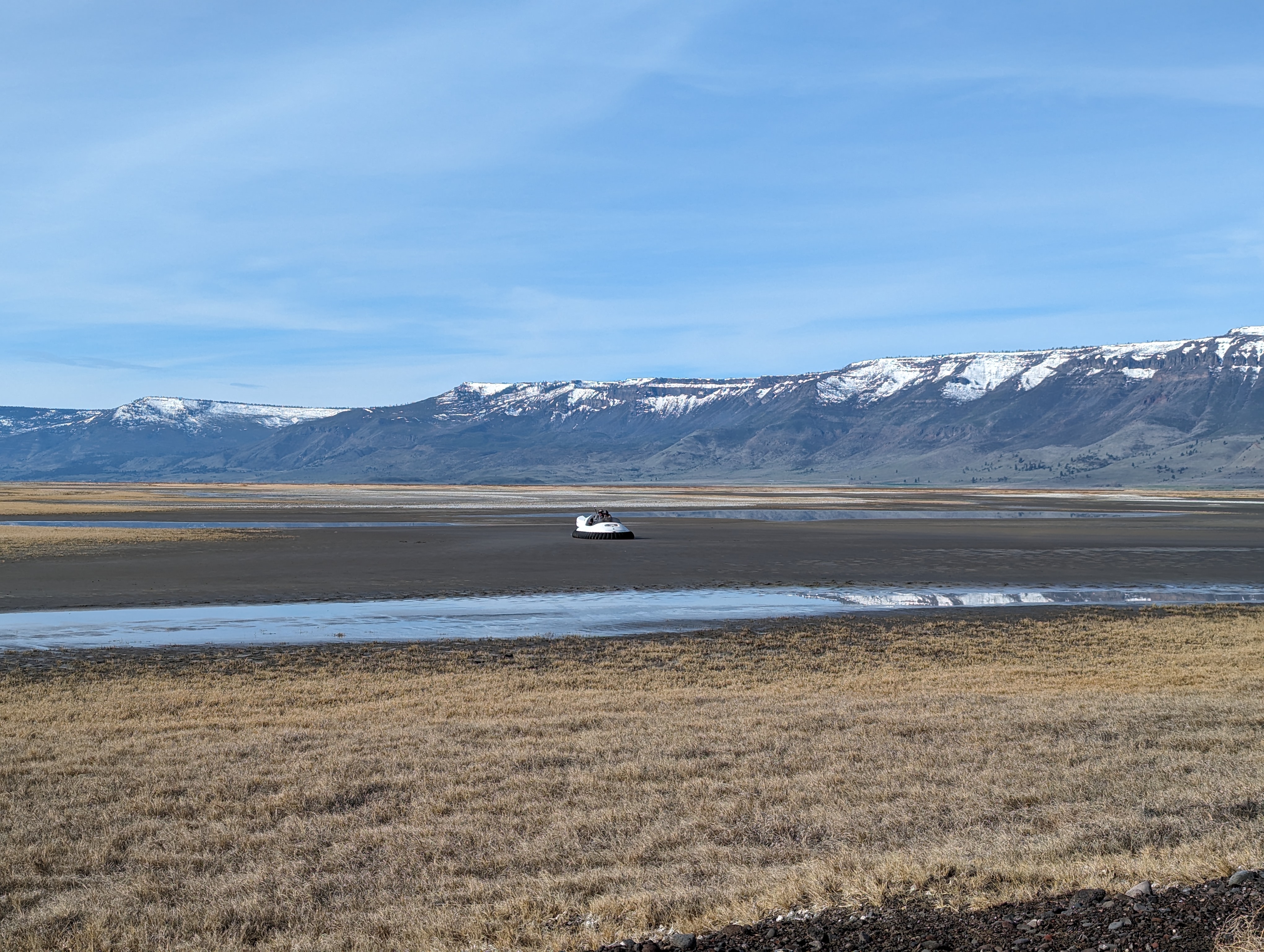 A hovercraft glides over the surface of Summer Lake, Oregon