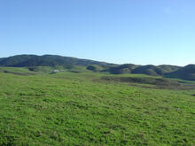 This view looking south from along Pierce Point Road shows the high ridgeline of Inverness Ridge at Mount Vision. The low hilly escarpment on the right consists of Monterey Formation. The Laird Sandstone underlies the grassy pastures in the foreground. This view is about a mile south of the entrance to Tomales Bay State Park.