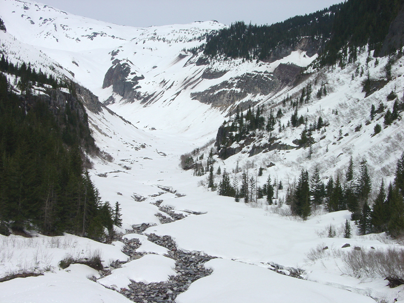 U-shaped valley looking upstream from the bridge over Nisqually Creek (draining from the toe of Nisqually Glacier on the south flank of Mount Rainier). Although most of the eruptive formation of the Mount Rainier Volcano occurred before the last major glaciation period of the Pleistocene Epoch, geologic forces are still changing the landscape; Eruptions of steam and tephra can trigger avalanches and debris flows, and lahars pose a major hazard to people living in valleys in the regional valleys and lowlands around the volcano (Crandell and Mullineaux, 1967).