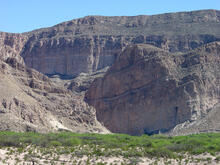 Boquillas Canyon formed over millions of years as the land steadily rose and the Rio Grande cut downward through the massive escarpment that forms the western flank of the Sierra Del Carmen, a north-to-south trending uplift that extends across the Texas and Mexico border in the eastern Big Bend area. Cretaceous age formations are exposed in the canyon mouth (Boquillas means little mouths in Spanish). From bottom to top, the canyon walls consist of the Del Carmen Limestone (lower cliff), Sue Peaks Formation (shaley slope), and Santa Elena Limestone (upper cliff and slope near ridgeline) (Maxwell, 1986).