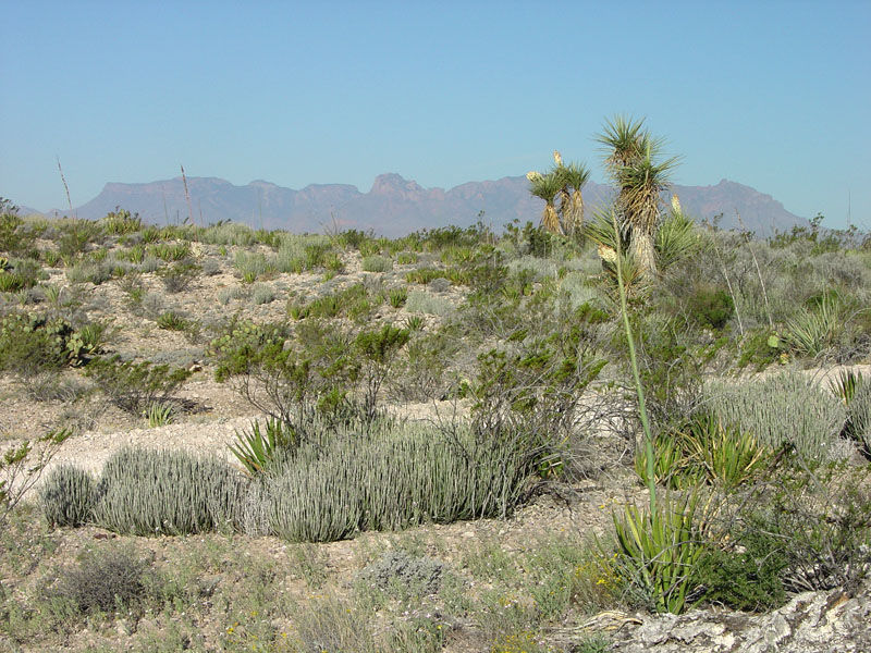 In the past, candelilla (Euphoria antispyhilitica) (the low broom-like plant in the foreground) was harvested in the Big Bend area to make wax. This view is from the Old Ore Road in eastern side of the national park (Maxwell, 1986). The high plateau of the Chisos Mountains is in the distance. The Chisos Mountains are the eroded remnants of a larger volcanic area that formed in Tertiary time (Eocene and Oligocene, and possibly later) (Kozman, 1986; Maxwell, 1994).