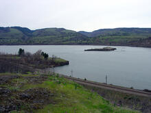This view is looking downstream along the central Columbia River Gorge at Memaloose State Park in the vicinity of Mosier, Oregon.