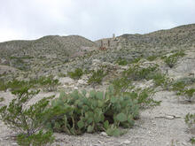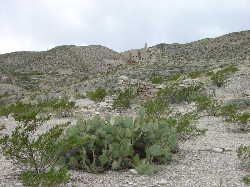 Creosote bush and prickly pear cacti grow amongst the ruins of the old mine buildings of the Mariscal Mine. The mercury mine was active in the early 20th century (NPS, 2009). It is located along the River Road in southern Big Bend National Park.