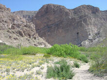 Spring flowers bloom on sand dunes along the floodplain of the Rio Grande. High cliffs of limestone form the mouth of Boquillas Canyon in the distance.