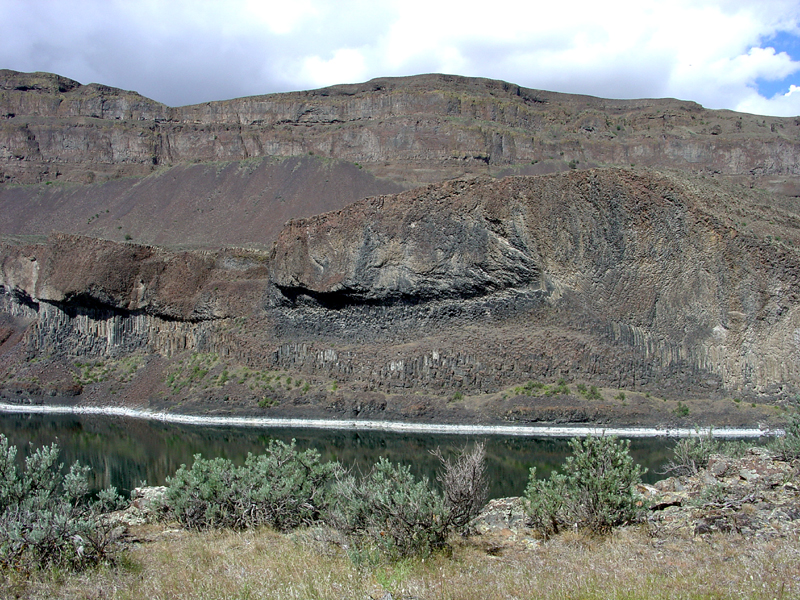 View looking west across Lake Lenore toward the west wall of Grand Coulee. Parts of the cliff consist of massive columns of basalt that formed as the molten rock shrank as it crystallized and cooled. The pattern in the cliff shows that the lava flows probably had channels and subsurface passages that resulted in variable characteristics in each of the flows. Also note the massive talus slopes along the upper cliff wall and the ring of alkali salts deposited along the lakeshore.