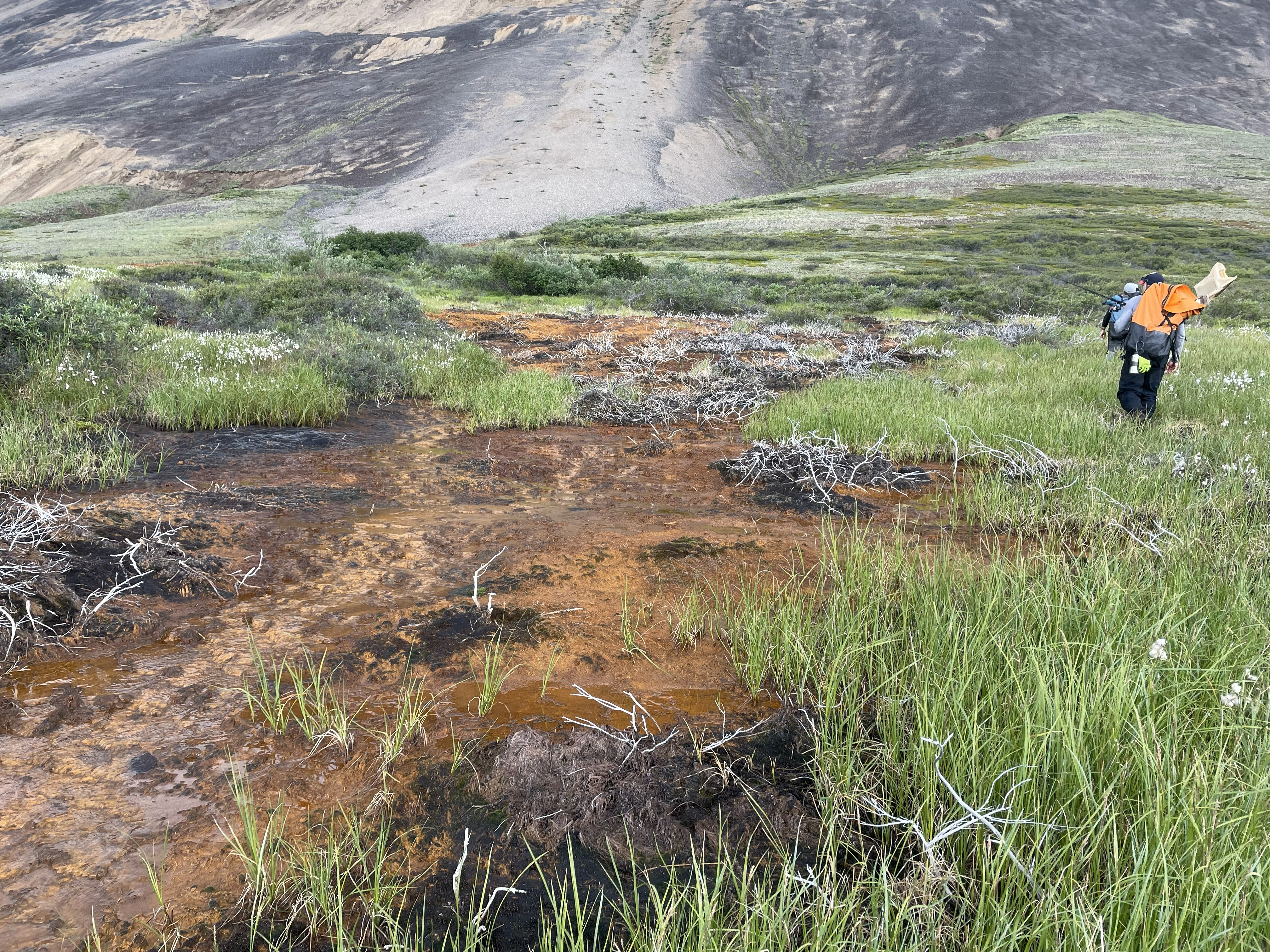 Orange streams are increasingly common in the Brooks Range of northern Alaska. The orange stream color reflects oxidized iron, but also often indicates elevated heavy metal concentrations. Our ongoing study aims to document these occurrences and the timing of their onset. By sampling orange stream chemistry and assessing their spatial and temporal distribution we aim to 1) test multiple hypotheses related to their cause and link to warming and thawing landscapes, and 2) consider the implications for downstream water quality and ecosystems.