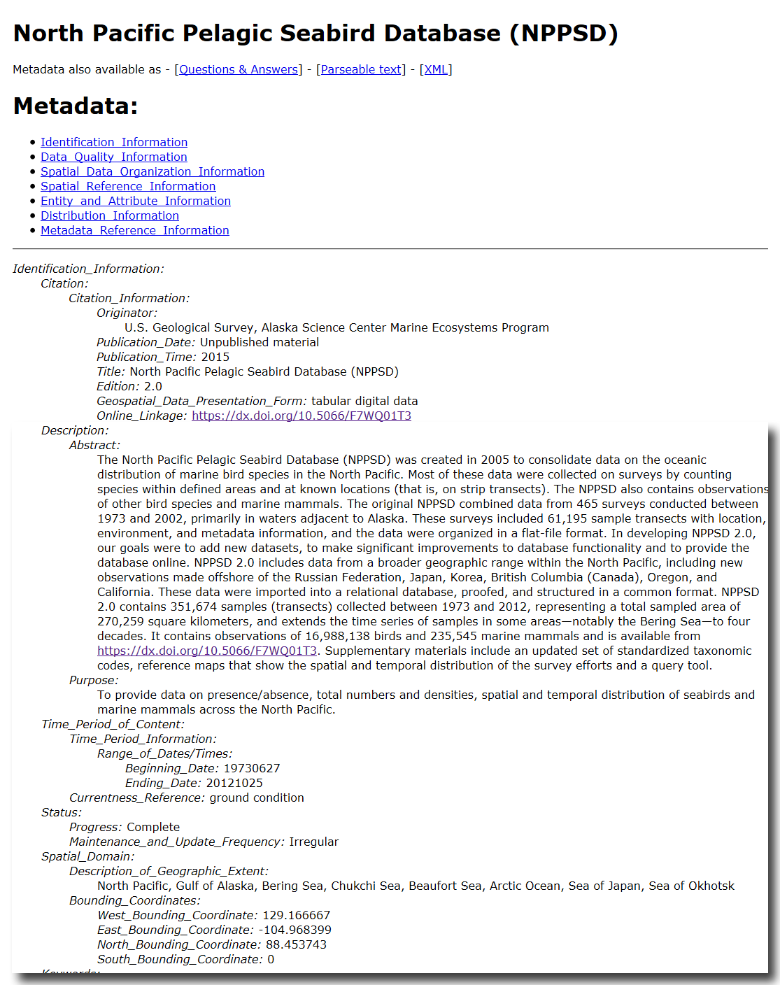 A screenshot from a metadata file of the North Pacific Pelagic Seabird Database.