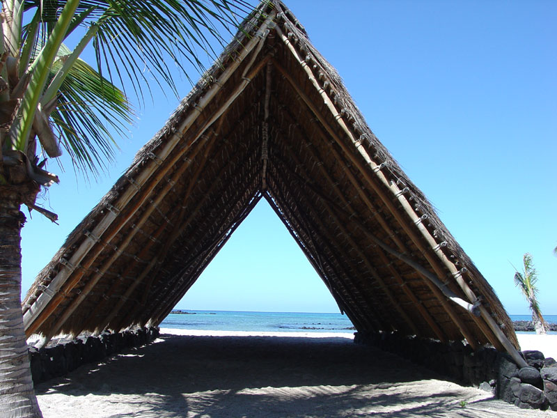 A traditional native Hawaiian building used for work, boat storage, and living on the beach at Kaloko.