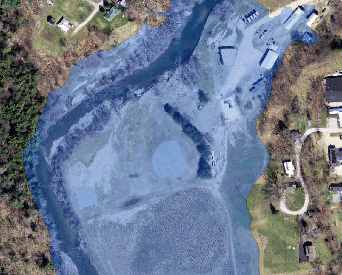 A visualization of the one-percent annual exceedance probability flood boundaries on the White River in the vicinity of Rochester, VT as documented in USGS SIR 2015-5056.