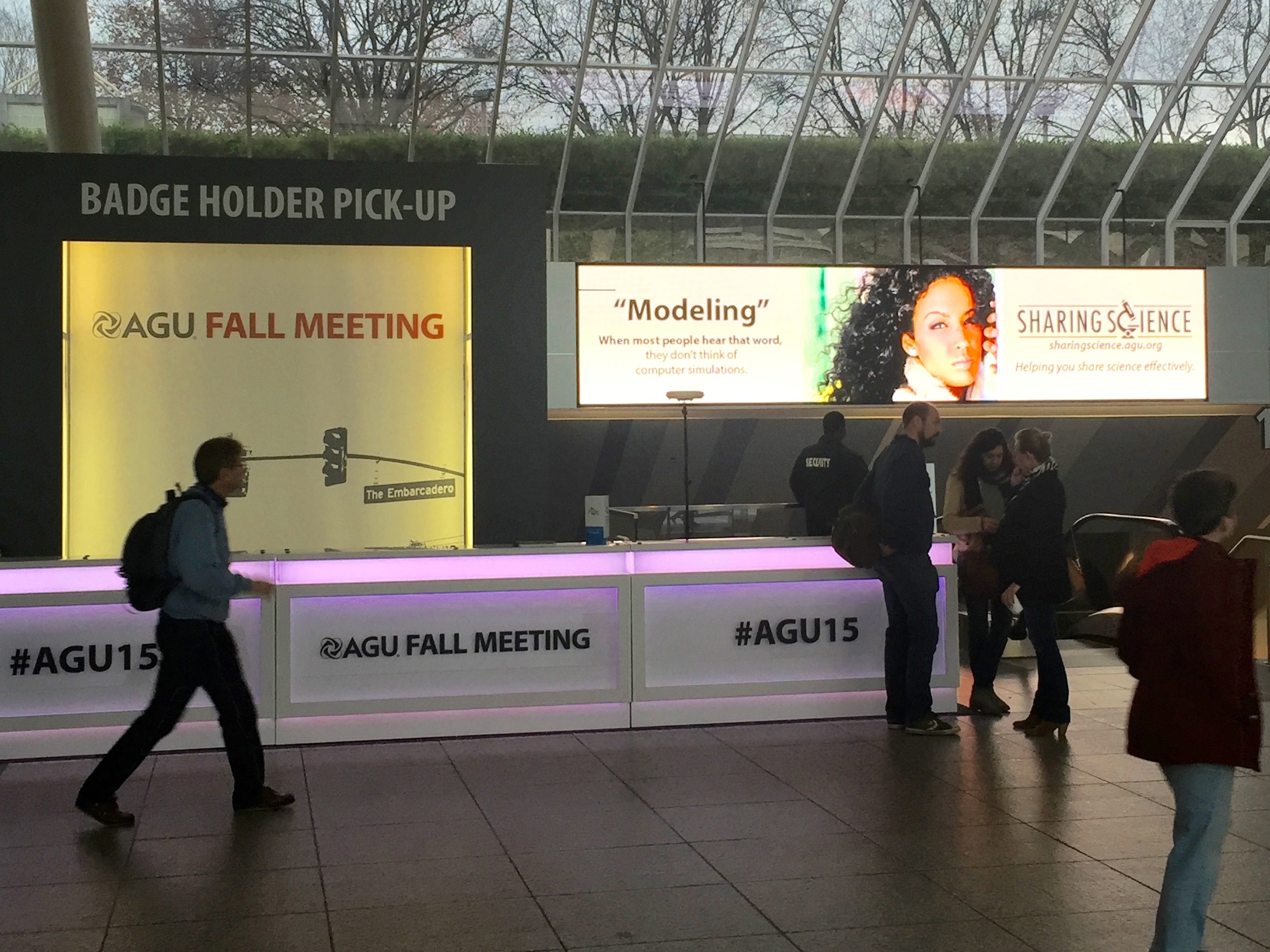 AGU Fall Meeting badge holder pickup booth inside the Moscone Convention Center, San Francisco. Several people standing or walking by. In the background, a sign says "Modeling. When most people hear that word they don't think of computer simulations. Sharing Science", with a photo of a female model's face.