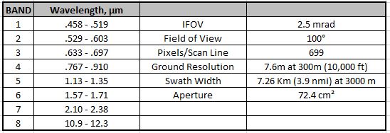 Aircraft Scanner NS-001 Multispectral Bandwidths Table