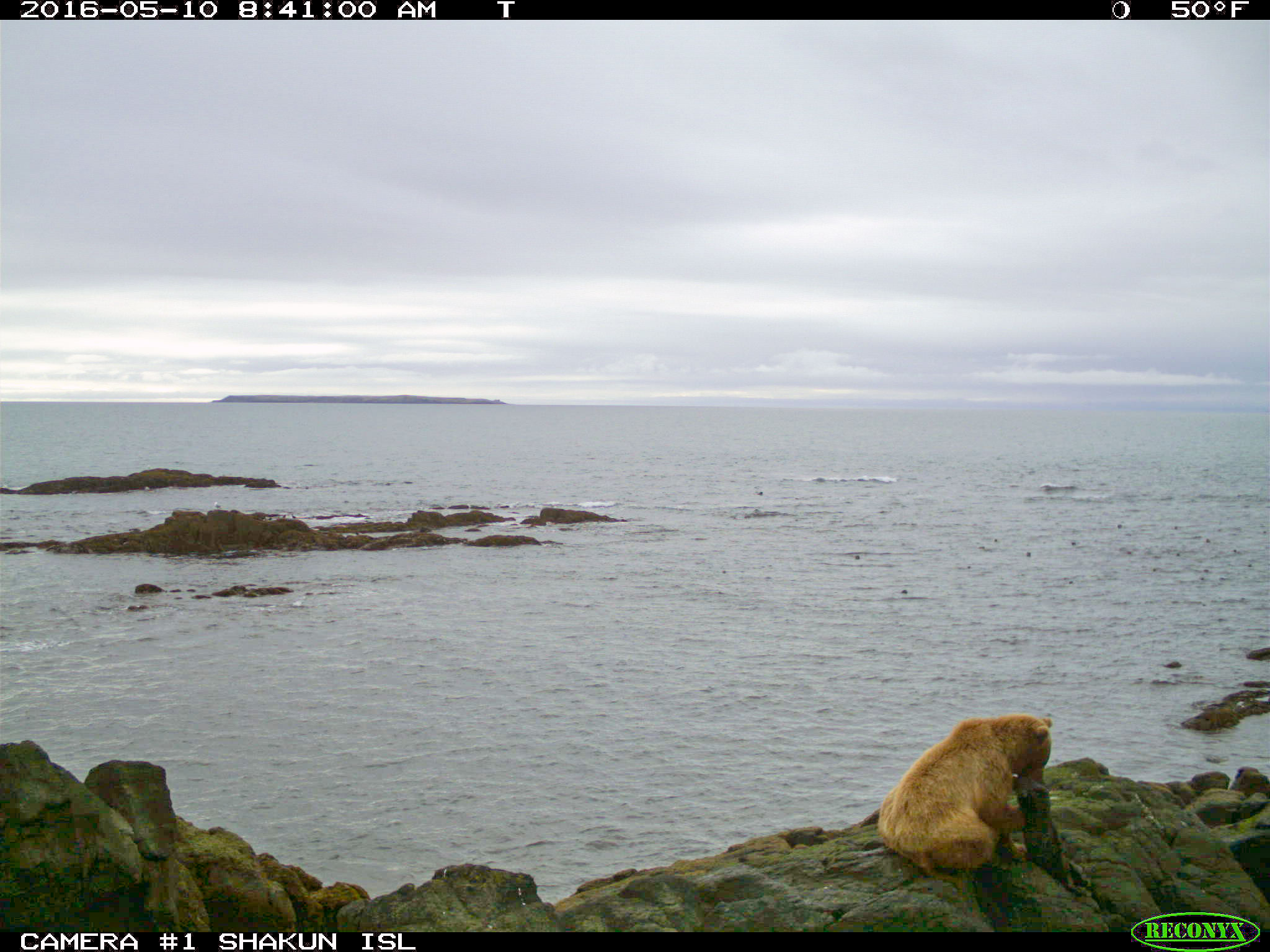 An image taken from a wildlife camera placed on Shakun Island off the Katmai coast. USGS researchers placed a camera after discovering many sea otter carcasses from the area appeared to have been consumed. Curious about whether these were predation events or post-mortem scavenging, they placed the camera and discovered, in cooperation with National Park Service biologists, that brown bears were making the swim out to the island to predate sea otters.