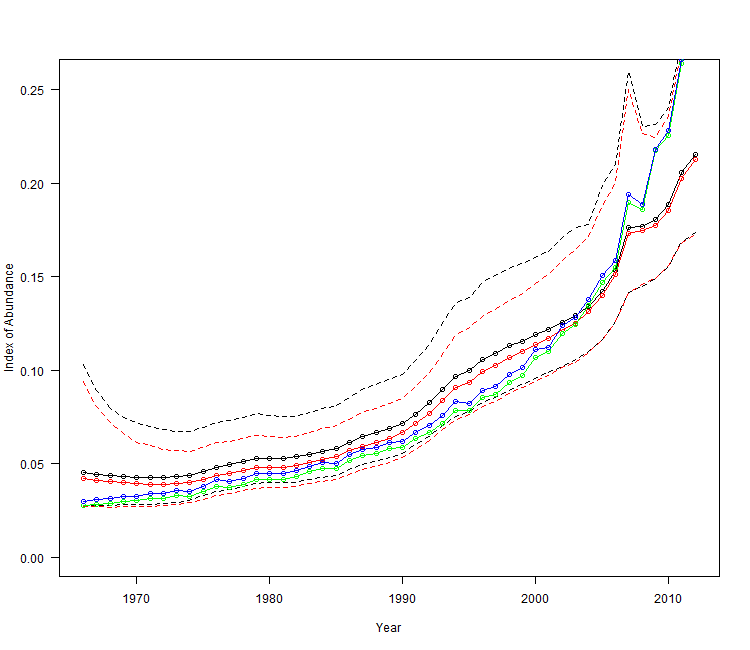 Alternative analyses can lead to differing views of population change. Lines represent alternative population trajectories for Bald Eagles from BBS analyses