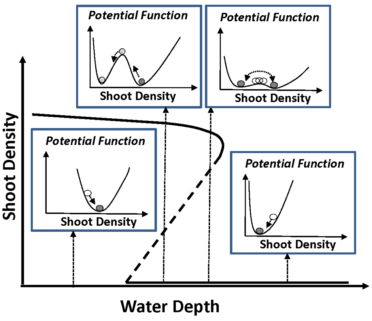 Bifurcation schematic showing the emergence of alternative states (high or no seagrass) as a function of water depth.