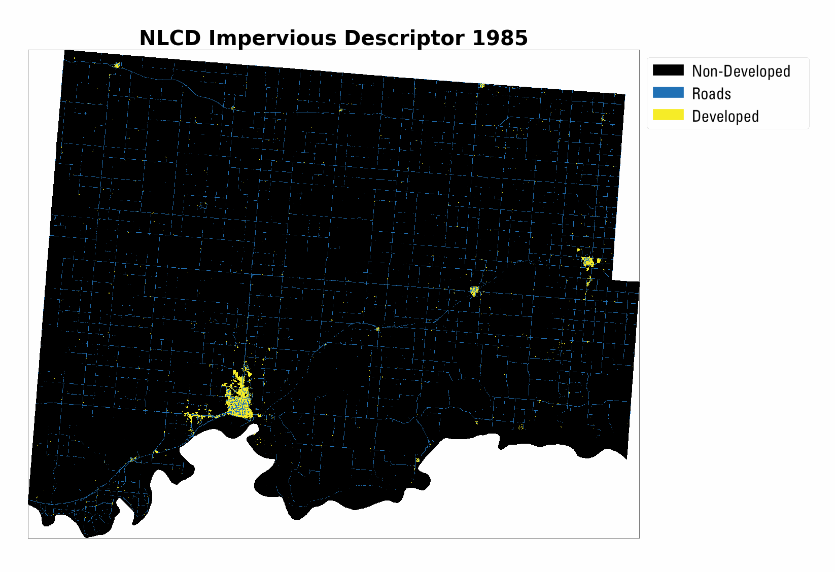 This is Williams County with the town of Williston, North Dakota, in the south. The Annual NLCD impervious descriptor layer categorizes roads (blue) and the other development (yellow). Across the county, the progression of new structures and well sites can be seen over 40 years, extending east and west along the roads.