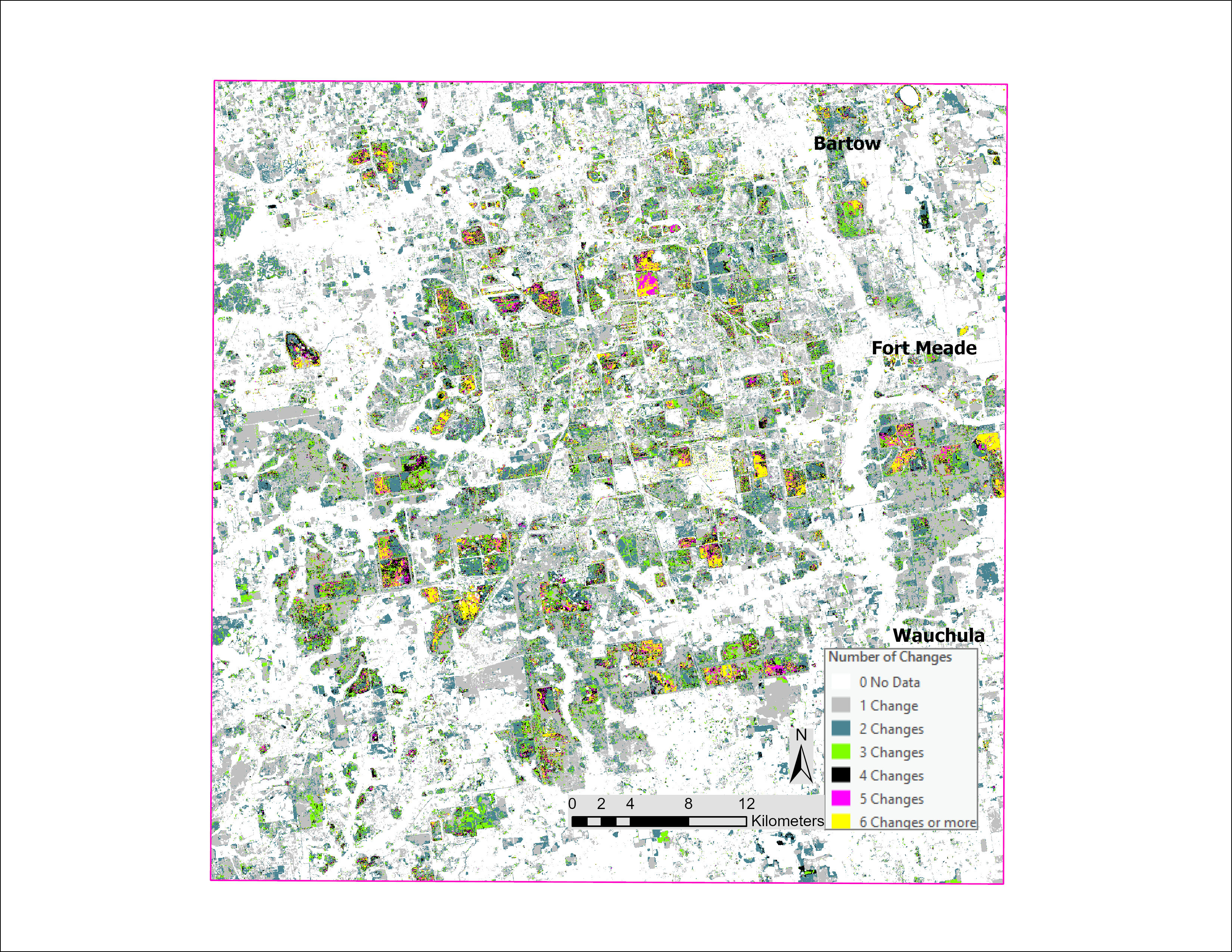 Annual NLCD Land Cover Change is shown color-coded by the number of times an area changes between 1985 and 2023 in Bone Valley, Florida.
