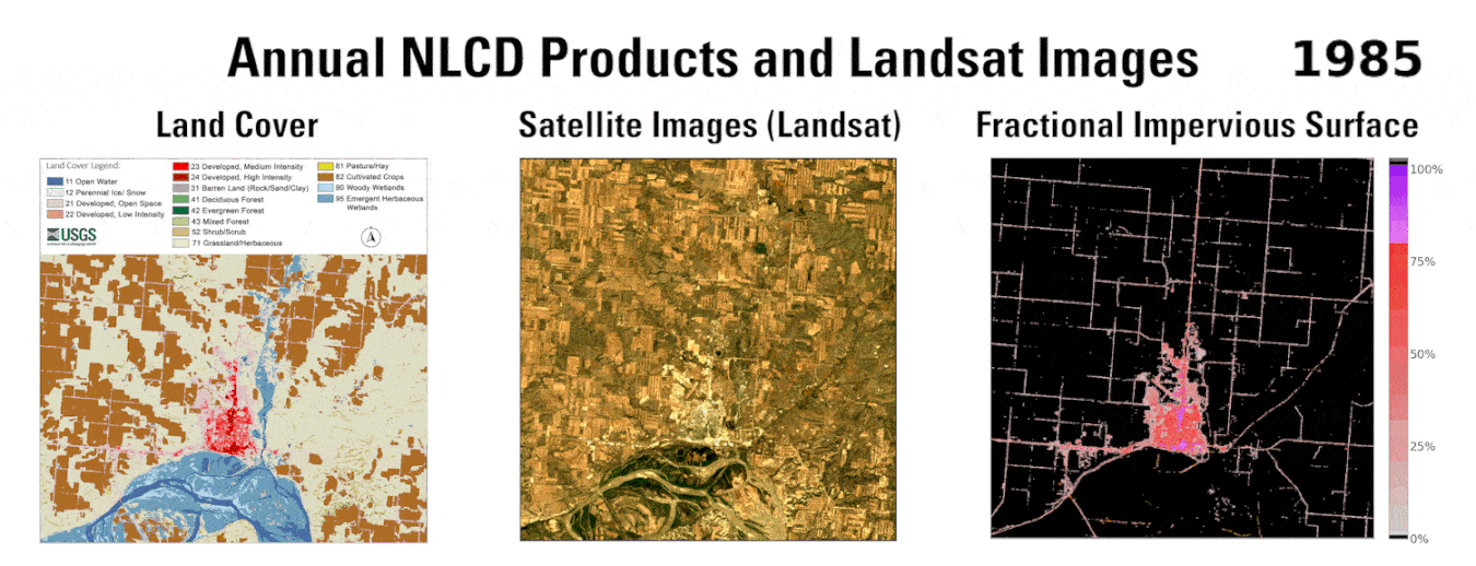 These three animations, including Land Cover (left), Landsat (center) and Fractional Impervious Surface (right), show the changes on the ground in the Williston, North Dakota, area over time between 1984 and 2024.