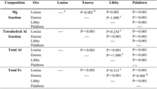 c Median EPMA compositional values of the unexpanded Louisa, Enoree, and Libby samples are statistically distinct from each other except for the Mg fraction and total Al in the unexpanded Enoree and Libby samples, and the tetrahedral Al fraction and total Fe in the unexpanded Louisa and Libby samples, which are statistically similar.