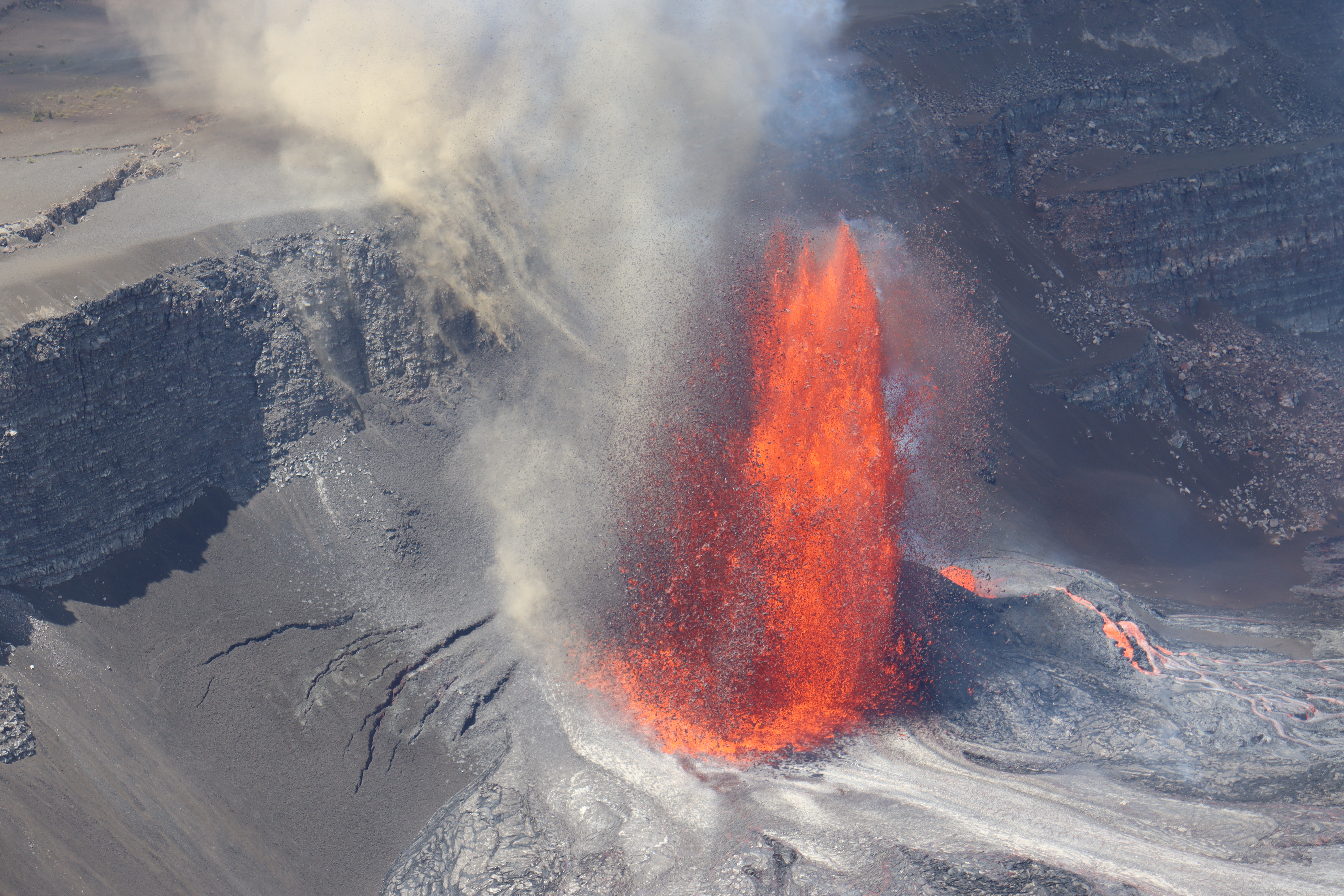 USGS Hawaiian Volcano Observatory geologist captured this aerial view during a monitoring helicopter overflight of episode 16 at around noon on April 1, 2025. The lava fountain feeds a lava flow from the western end of Halemaʻumaʻu. This lava fountain reached heights of more than 650 ft (200 m) high and was blanketing the western part of the summit to Highway 11 with tephra clasts. Clasts were larger closer to the fountain. USGS photo by D. Downs.