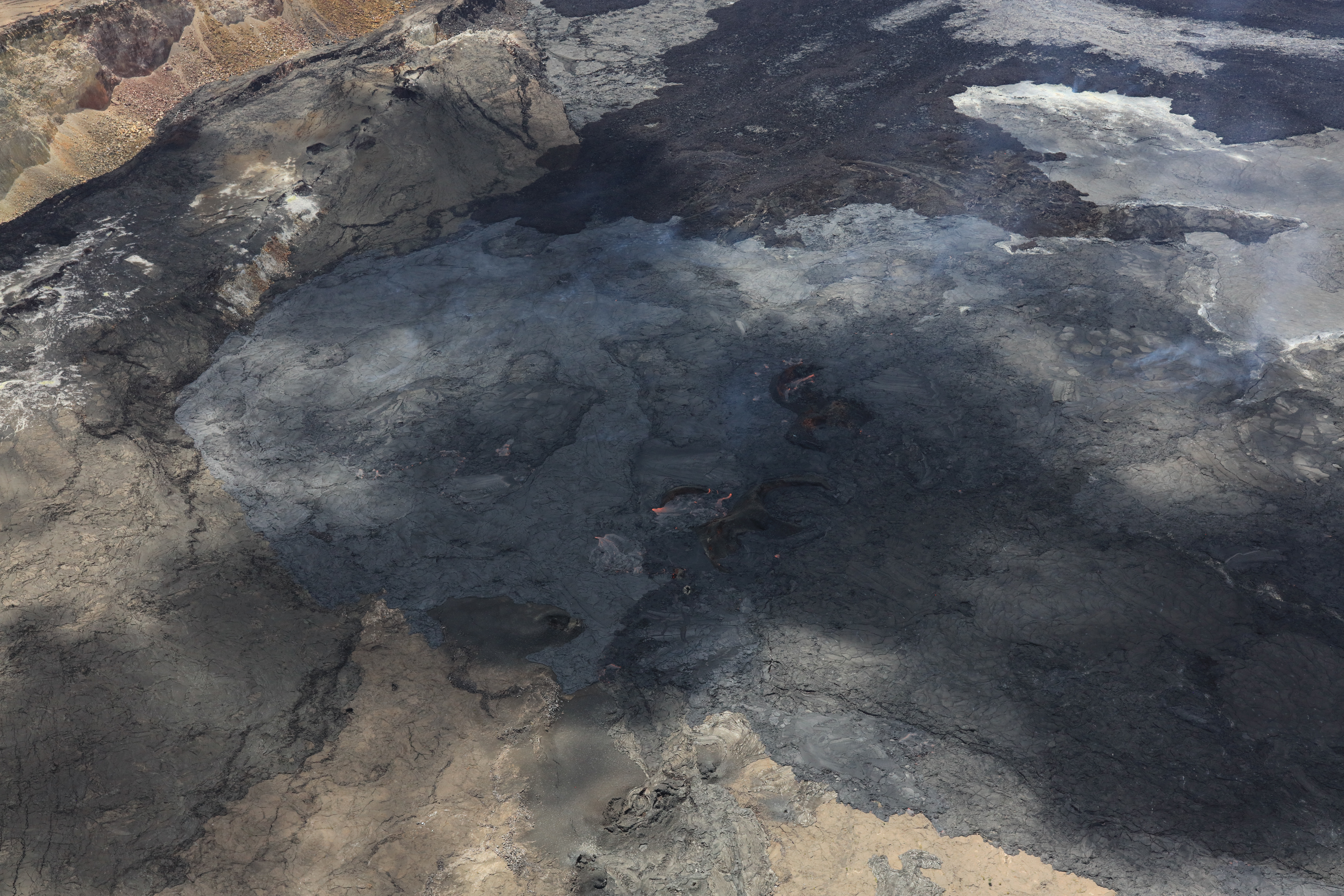 Episode 16 of the ongoing eruption in Halemaʻumaʻu stopped just after noon today, April 2, 2025. On a USGS Hawaiian Volcano Observatory monitoring overflight within the hours following its end, the crater floor was a patchwork of active and inactive lava flows. In this photo, active lava oooze-outs are visible near the vents that erupted in September 2023, which are slowly being buried by lava flows during the recent eruptive episodes. USGS photo by K. Lynn.